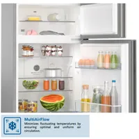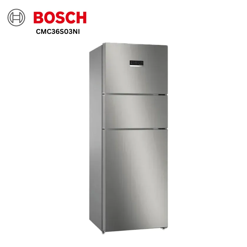 This sleek freestanding refrigerator boasts a generous 330-liter storage capacity, finished in a stunning shiny silver.