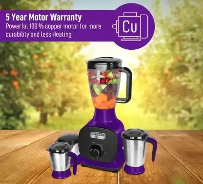 Faber mixer grinder is designed to assist your cooking needs and help you prepare finely blended recipes in minutes. This mixer grinder enables you to prepare chutneys, gravies, mix ingredients and even fine pastes. Faber mixer grinder comes with three/four jar* that are easy to hold, clean and use for easy maintenance. The body of this appliance is made of completely shockproof ABS material. Stainless steel jars come with flow breakers and a heat sensitive cut off, which controls and protects against voltage fluctuation. It has a powerful 100% copper motor with automotive ball bearing and is powerful enough for your varied food preparations, giving you fine grinding efficiency.