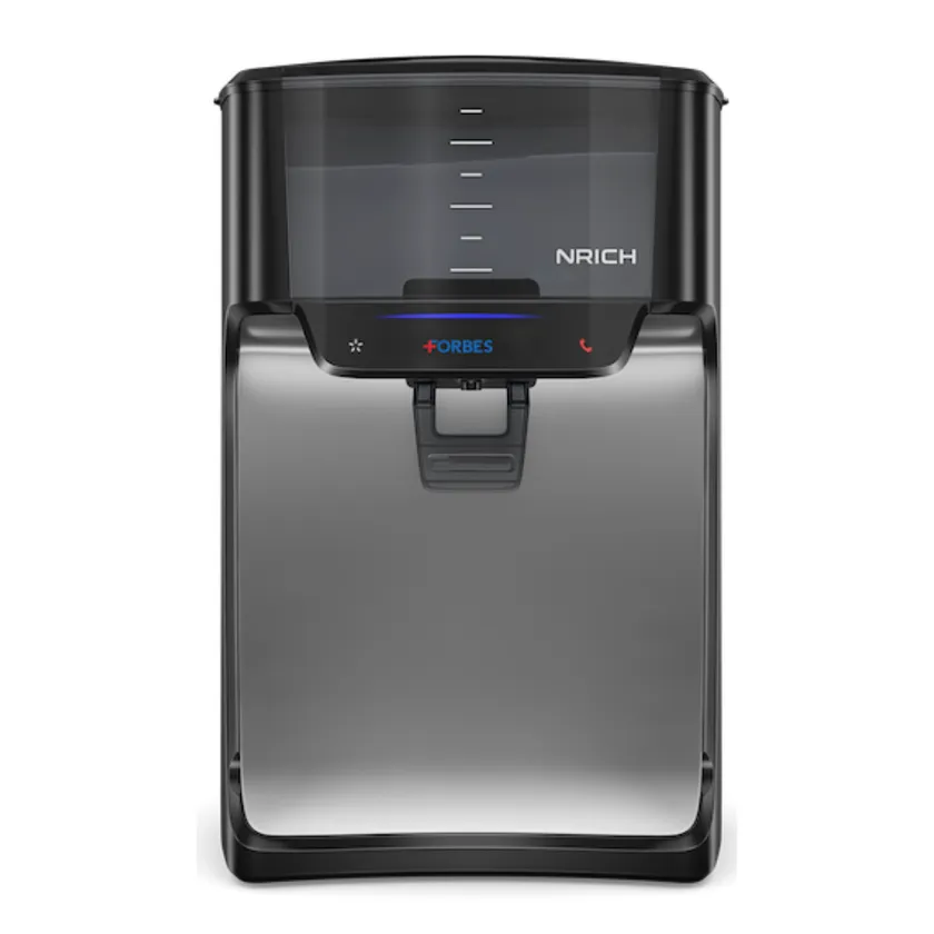 Forbes NRICH UV uses a 6-stage purification process with e-boiling+ to remove bacteria, viruses, and protozoa, ensuring safe drinking water. It features an intuitive LED display, advanced cartridges, large storage, and technologies like Active Copper Maxx, Biotron, and Mineral Guard. A booster pump ensures high-pressure water flow in low-pressure areas.