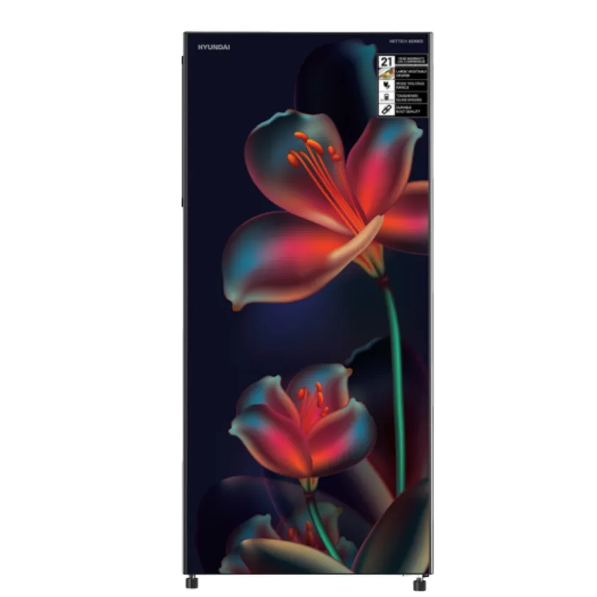 Hyundai 180 L Glass Door Refrigerator with floral finish, tempered glass shelves, and a big freezer. It comes with interior lamp, bottle rack, stylish handle, and lock & key. Enjoy smart cooling, heavy-duty compressor, and stabilizer-free operation for easy and reliable use.