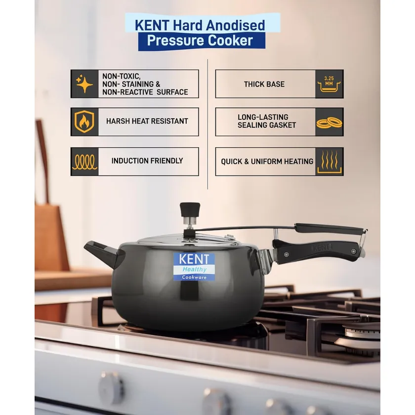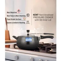 Presenting KENT Hard Anodized Pressure Cooker with SS Inner Lid that can withstand regular use on high levels of heat and ensure high standards of hygiene and durability. It is made of non-toxic, non-staining, & non-reactive material with 3.25 mm thick base that makes it induction friendly.