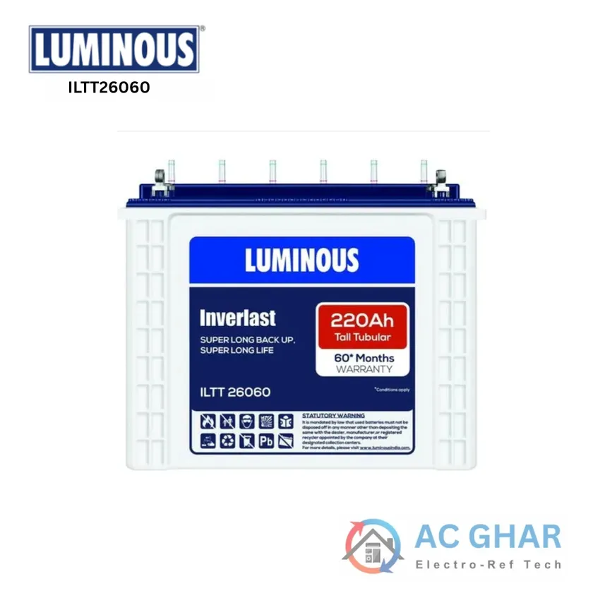 The Luminous ILTT 220Ah battery is specially engineered for use with inverters to ensure continuous power supply. Its tubular design enhances its efficiency, offering a much longer lifespan compared to flat plate batteries.This makes it a great choice for long-term investment in backup power. The battery's 220Ah capacity makes it suitable for medium to large-sized homes or commercial setups, providing enough backup for household appliances like lights, fans, and other essential electrical devices.