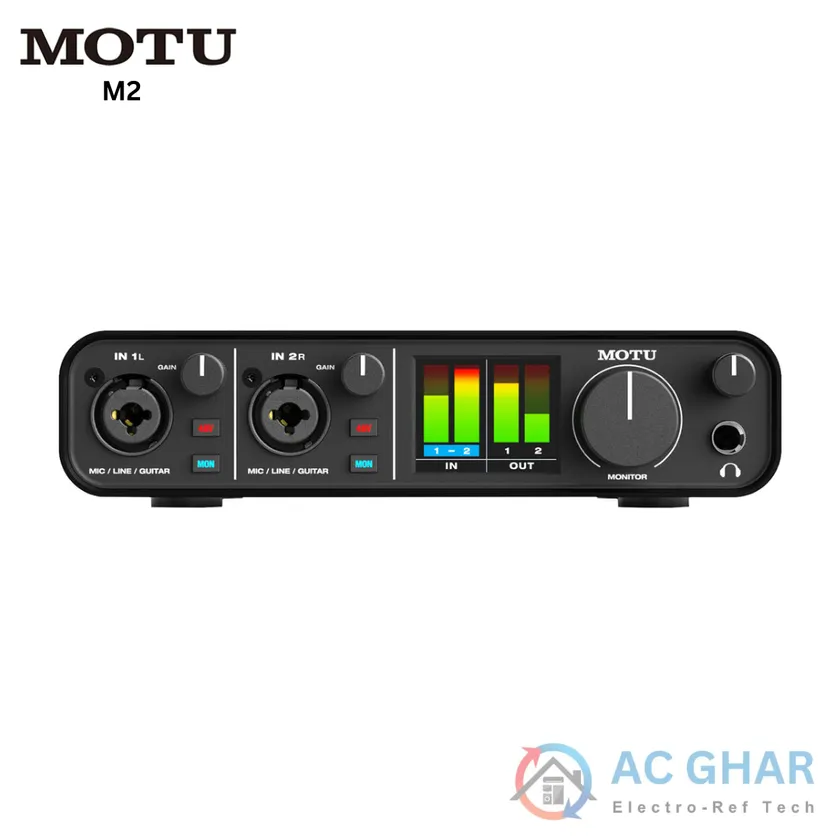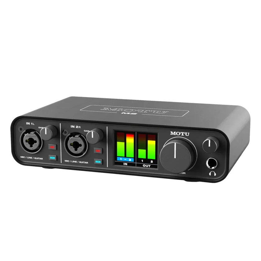 The MOTU M2 delivers top-tier sound quality, ultra-low latency (as low as 2.5ms), and versatile connectivity. Featuring ESS Sabre32 Ultra DAC technology with 120dB dynamic range, it ensures premium analog audio performance. This single-rack unit includes two mic preamps, DC-coupled outputs, an ESS-driven headphone output, and MIDI I/O for seamless integration.