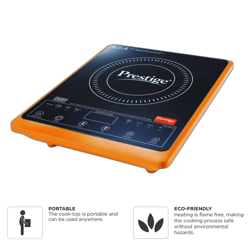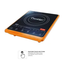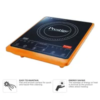 Introducing the Prestige 2000 Watts Power Induction Cooktop, a stylish orange appliance designed for efficient cooking. With Indian menu options and an automatic voltage regulator, this cooktop ensures safe and reliable performance. Its aerodynamic cooling system and insect-proof design enhance durability, while power saver technology contributes to energy efficiency. The intelligent design features touch buttons for easy operation and hassle-free maintenance.